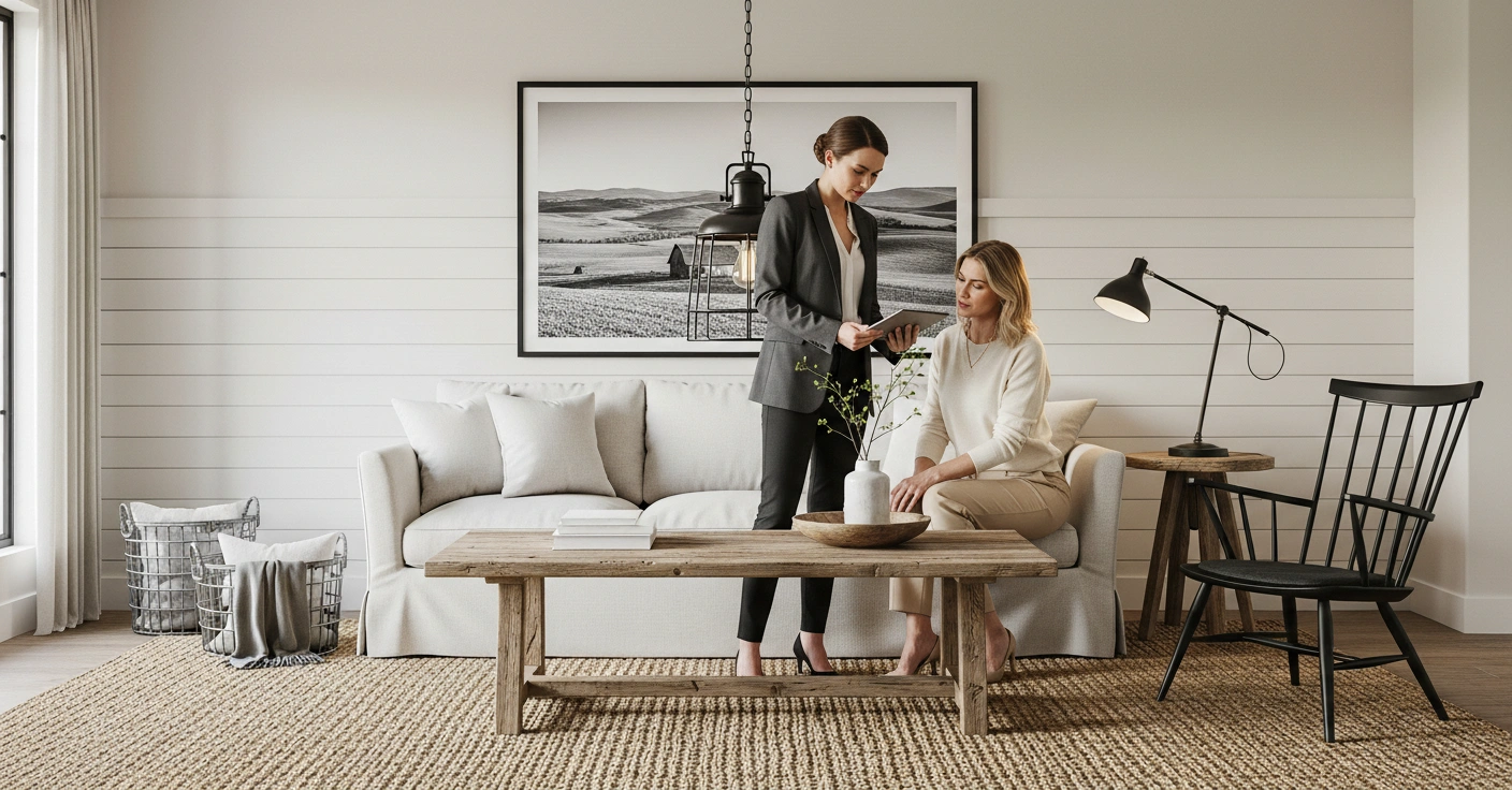 Step 2 — The Ask: Always request a photo of the client's room early in the consultation — ideally before they have committed to a specific piece. Frame it casually: "Would you mind snapping a quick photo of the space? It helps me give you a much more accurate recommendation."